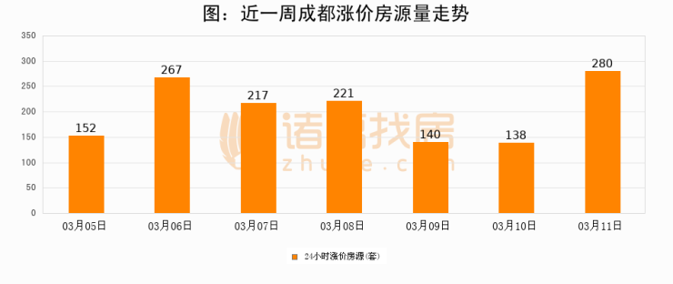 根据诸葛找房数据显示,成都24小时涨价房源量为280套,较03月10日增加142套,环比上涨102.9%。与此同时,涨价房源占比小幅扩大,业主信心有所提升。