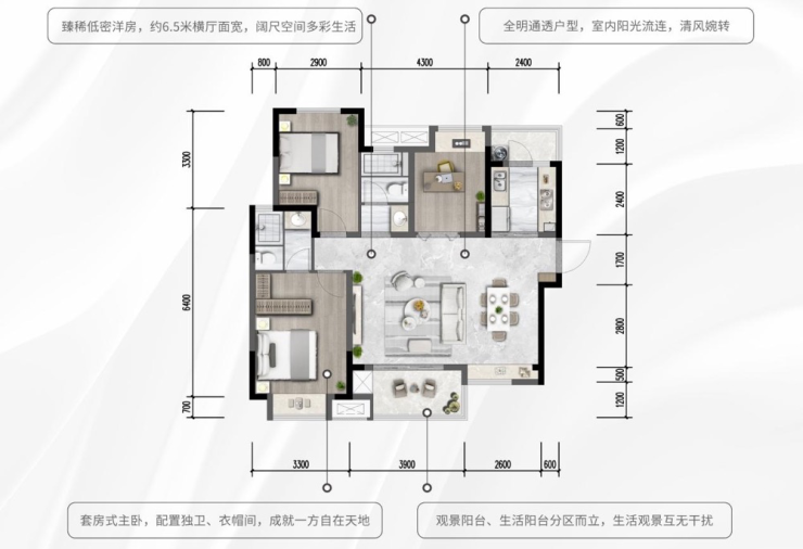 约6.5米横厅面宽,阔尺空间多彩生活;三面朝南全明气派,室内阳光流连,清风婉转;观景阳台、生活阳台分区而立,生活观景互无干扰;套房式主卧,配置独卫、衣帽间,成就一方自在天地。