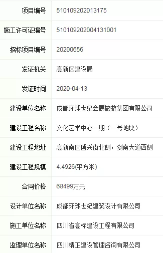 4月13日,建设工程名称为“文化艺术中心一期(一号地块)”的项目取得施工许可证,项目位于高新南区盛兴街北侧,剑南大道西侧,合同工期900天。