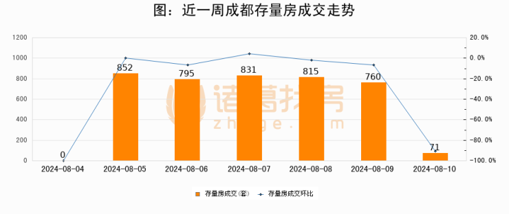 从存量房来看,2024年08月10日成都存量房单日成交71套,比昨日减少689套,环比下降90.7%。从近一周存量房成交来看,成都存量房日均成交套数为589套,08月10日单日成交71套,低于近一周平均水平87.9%。