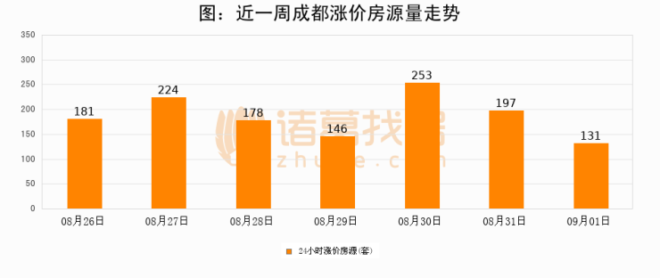 根据诸葛找房数据显示,成都24小时涨价房源量为131套,较08月31日减少66套,环比下降33.5%。与此同时,涨价房源占比小幅回落,对于购房者来说是一个入市窗口期,购房者可抓住时机入市。
