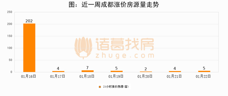 根据诸葛找房数据显示,成都24小时涨价房源量为5套,较01月21日增加1套,环比上涨25%。与此同时,涨价房源占比小幅扩大,业主信心有所提升。