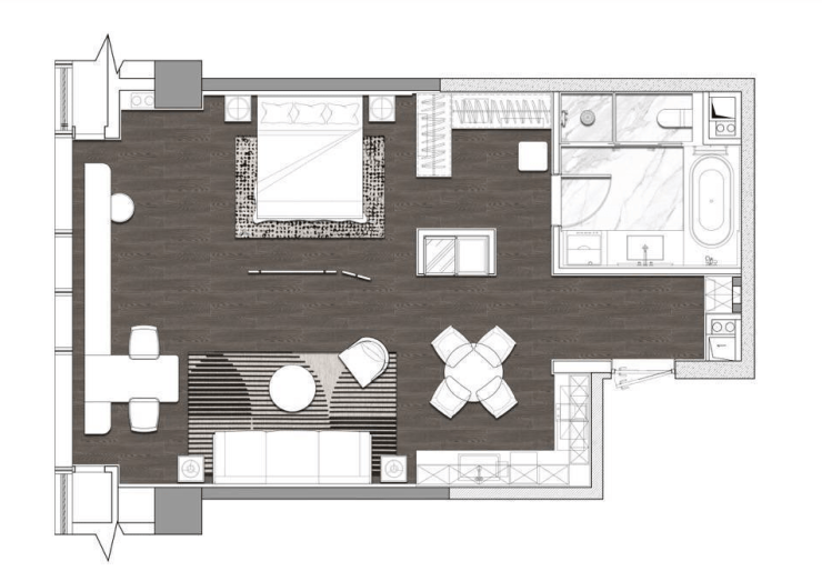 B、C户型面积60㎡、69㎡,采用精致当代的设计风格,以“无界”生活为设计主题,构建出一座给未来派 KOL(key of leader)的“定制私寓”空间。客餐厨和玄关一体化的新锐布局;放式厨房搭配功能性吧台,具备社交沙龙属性的同时又赋予家的舒适;超大尺度的落地窗景灵动套卧设计,设置豪华卫浴四件套与独立衣帽间结合;衣帽间合理的分区,大容量的收纳,质感体验与私密性交融于此。