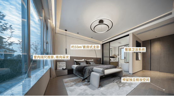 此外,相较于市面上千篇一律的主卧设计,花千樾叠墅则让人眼前一亮。约33㎡套房式主卧+室内阔尺观景+奢装卫浴系统+预留独立梳妆空间,豪气格局尽显空间尺度感,营造尊崇舒心寝居。花千樾更大限度的将舒适美学赋予生活。