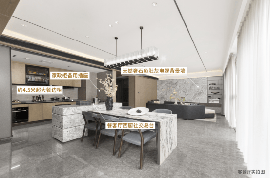 在超大餐客厅,还有更多圈粉设计带来惊艳。像天然奢石鱼肚灰电视背景墙,温润艺术质感彰显现代轻奢格调;约4.5米超大餐边柜,贴心考量家庭烹饪习性,人性化设计让厨房操作更流畅;还有当下盛行的餐客厅西厨社交岛台,可以是厨房的延伸空间,也可以是家庭品味社交空间,为墅居生活增添更多浪漫。花千樾匠心设计精于毫厘间,让购墅者无不被深深打动。