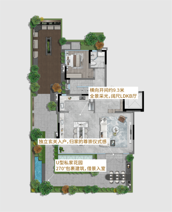 例如在叠墅里,U型私家花园270°围合墅居,让自然景致诗意延伸到室内;横向开间约9.3米,雍容格局领略全景采光,以他处无法媲美的墅居风范,致敬城市头排人物;花千樾还深入研读层峯人士生活动线,科学设计阔尺LDKB厅,奢侈空间延伸生活奢享,犒赏成功人生。