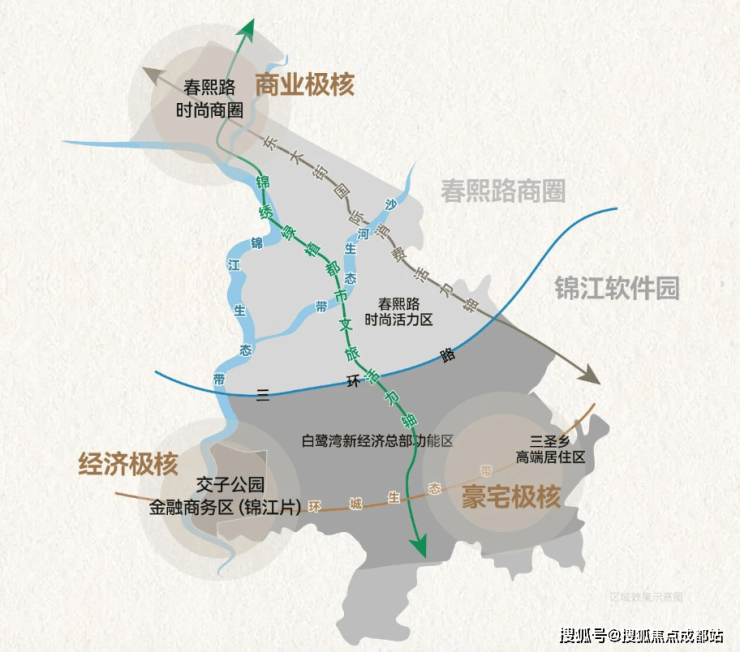 “一核两轴三带三区”锦江规划交融成都“向东向南发展、回归主城态势中国三圣乡驸马半岛,屹立在多重战略交汇点笃定城市发展价值高地
