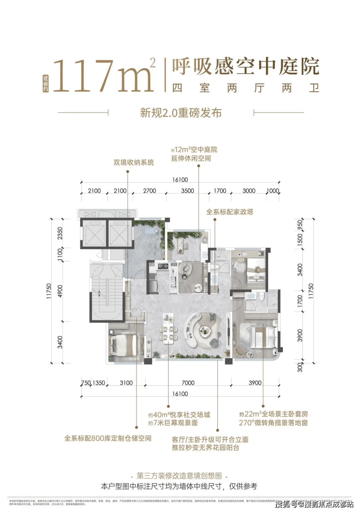 建面117㎡全四房(入门改善首选):总价370万起,17层小高层,得房率约110%,室内约8㎡延伸空间,公区面积达40㎡,搭配7米大开间,两个次卧面积均超10㎡,适配二胎家庭或三代同堂入门改善需求。
