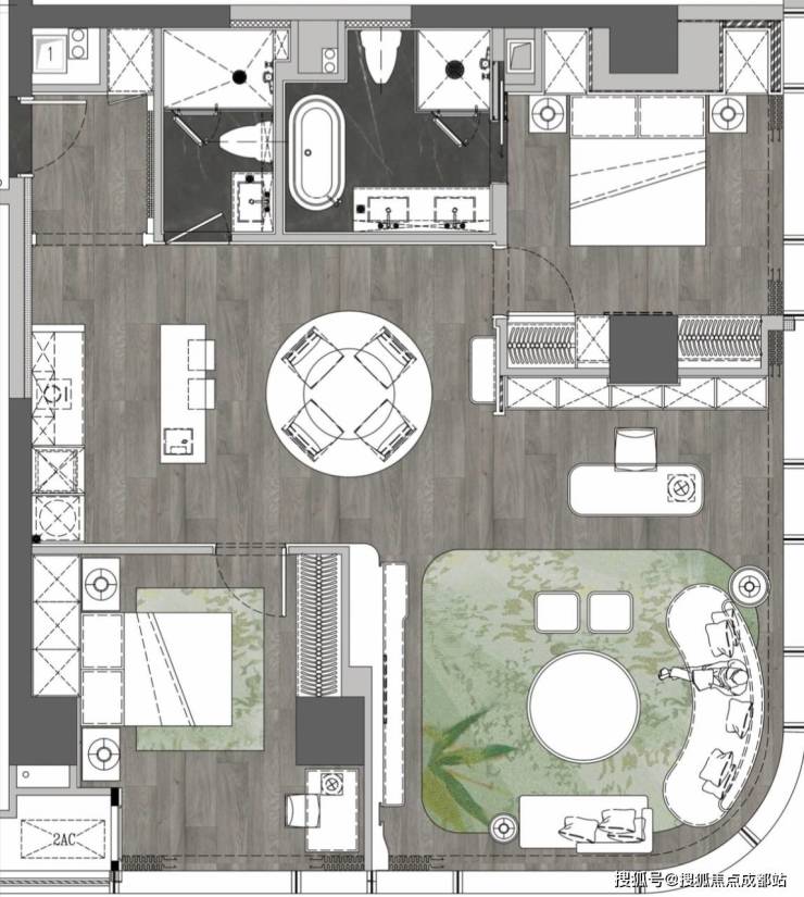 功能分区:整体公区空间和尺度令人满意,各功能区划分明确,互不干扰。主卫墙面以白瓷为主,以绿野仙踪石材为底,白色空间中加入绿色元素,升华调性品质感,体现了对细节的极致追求。