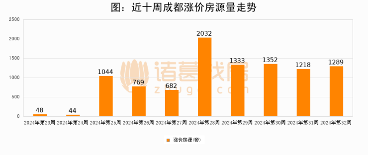 从调价房源来看,第32周成都涨价房源1289套,较上周上涨5.8%。与此同时,32周涨价房源占比回落0.51个百分点,业主信心小幅波动,购房者可则需入市。