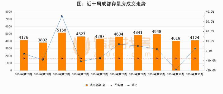 存量房方面,第32周成都存量房成交4124套,较上周增加105套,环比上涨2.6%。从近十周成交走势来看,周均成交套数为4459套,本周低于平均水平7.5%。
