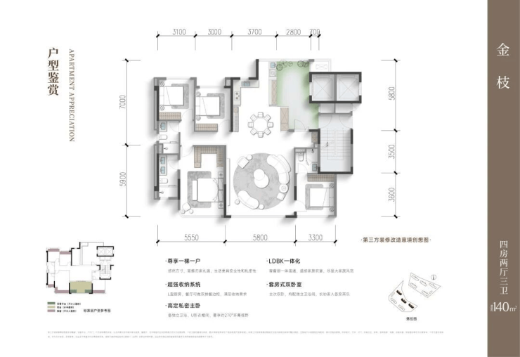 140㎡的洋房户型拥有约 21㎡的入户光厅和约 44.3㎡的餐客厅,同样采用双套房设计。值得一提的是,主卧可进行“小家化”设计,空间灵活多变,甚至能将四房改造成五房,满足家庭不同阶段的需求。 160㎡四房两厅三卫