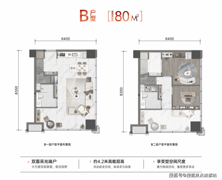 A户型(50㎡):约4米景观面宽+8.35米进深,可打造“卧室+工作室+社交区”复合场景,层高4.2米支持灵活分割,如搭建夹层增加储物或卧室功能。