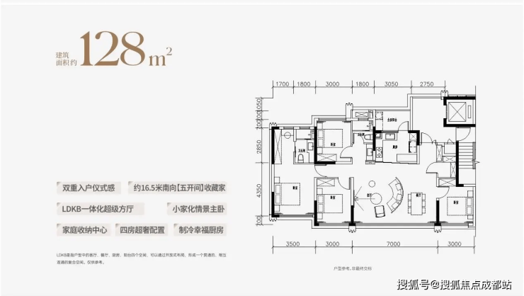 以建面约128㎡户型为例,其南向面宽达约16.5米,实现了罕见的“五开间”朝南格局。LDKB一体化超级方厅的设计,将客厅、餐厅、厨房、阳台贯通连接,形成开阔的家庭核心互动区。双重入户仪式感、独立空中花园、双套房配置、小家化情境主卧等细节,无不体现出对改善家庭生活需求的深度洞察。