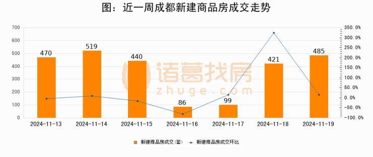 根据成都市住房和城乡建设局数据显示,2024年11月19日成都新建商品房成交485套,较昨日增加64套,环比上涨15.2%