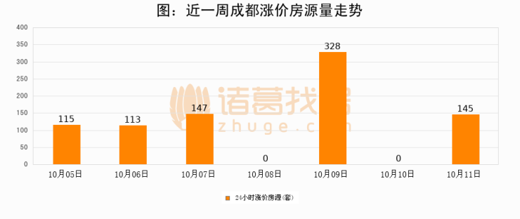 根据诸葛找房数据显示,成都24小时涨价房源量为145套,较10月10日增加145套,环比上涨0%。与此同时,涨价房源占比小幅扩大,业主信心有所提升。
