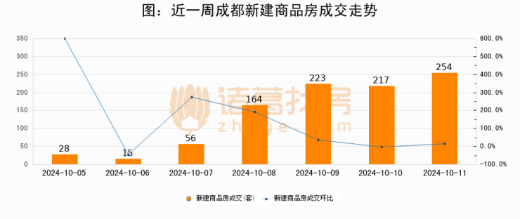 根据成都市住房和城乡建设局数据显示,2024年10月11日成都新建商品房成交254套,较昨日增加37套,环比上涨17.1%