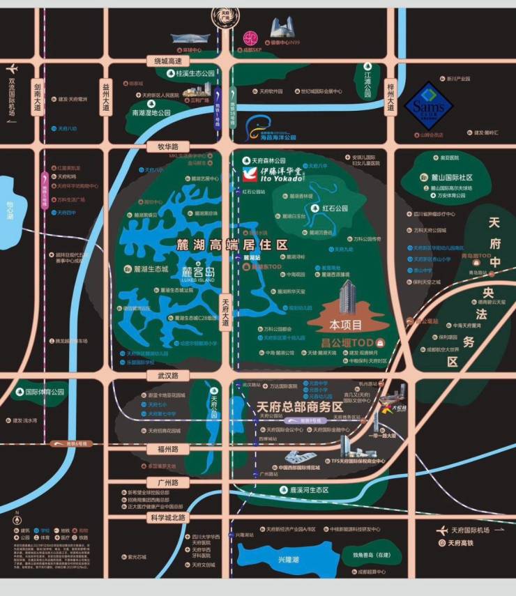 【交通】国际交通枢纽 3大TOD赋能;拥享双4F级国际机场,全国第三座国际枢纽;三纵一横(剑南大道、天府大道、梓州大道、武汉路);1/6/18号线3条地铁已开通;700米到6号线昌公堰站,1.4公里→1号线麓湖站