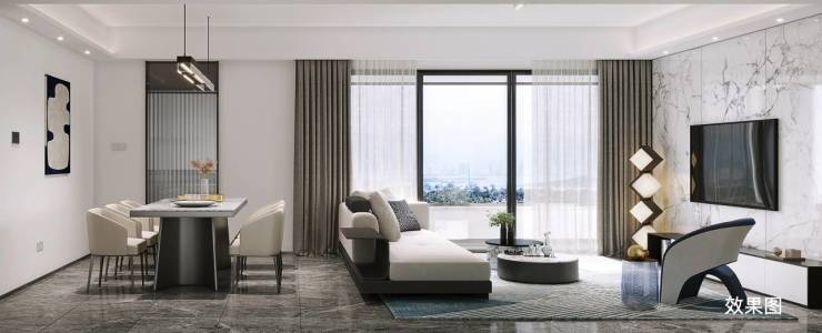 约4.2米宽境尺度客厅,贯连约7.8米南向景观阳台。270°转角环幕视野,三面采光,重构家庭丰盛场景
