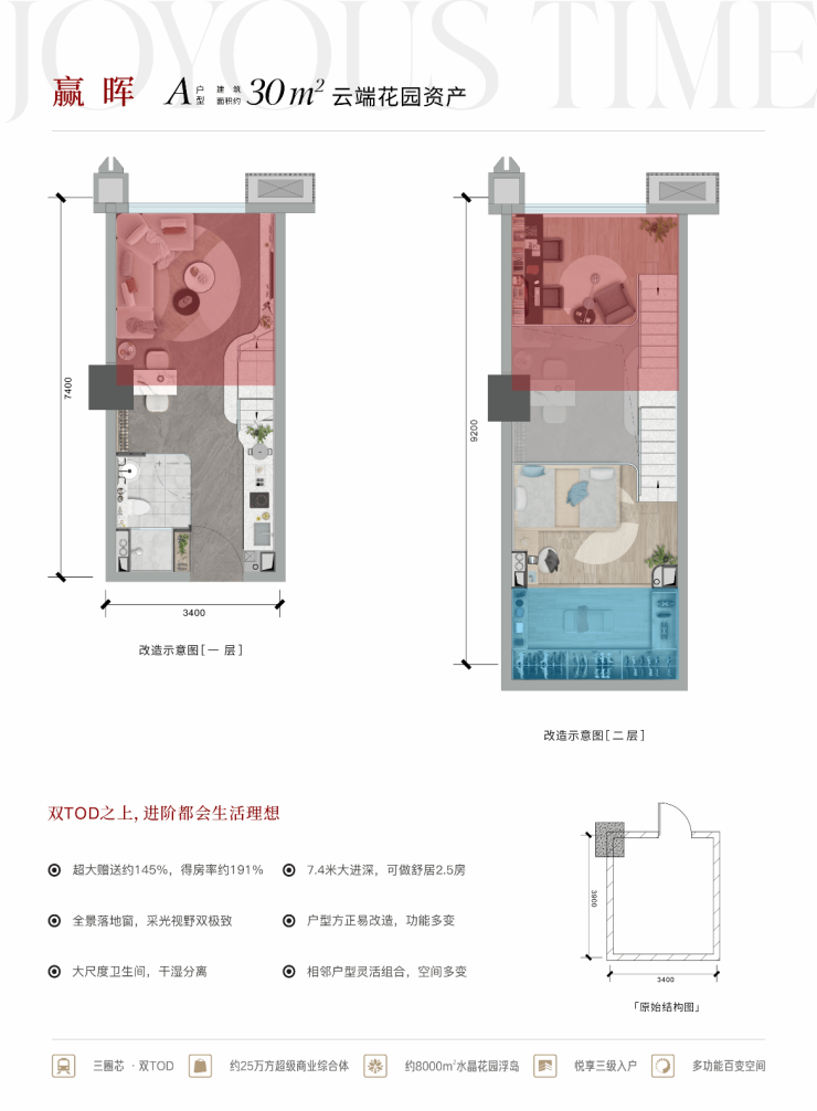 3、舒居产品:8000㎡超大空中花园,三重归家入户(-2F地铁光厅入户、双首层入户、空中花园入户),户型超大赠送,30㎡舒居套二,使用面积高达57平,空间感十足。