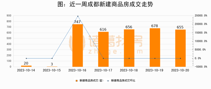 根据成都市住房和城乡建设局数据显示,2023年10月20日成都新建商品房成交655套,较昨日减少23套,环比下降3.4%