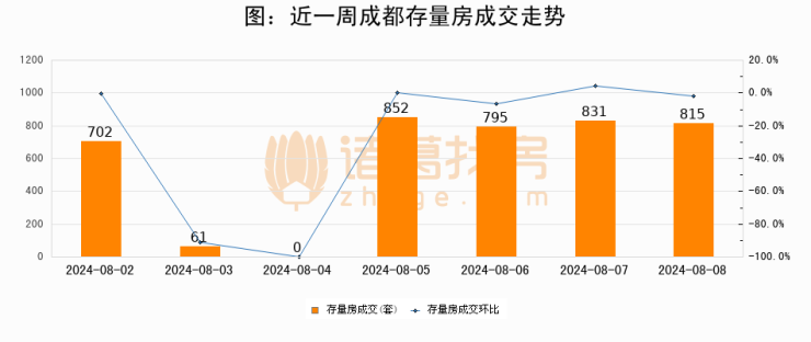 从存量房来看,2024年08月08日成都存量房单日成交815套,比昨日减少16套,环比下降1.9%。从近一周存量房成交来看,成都存量房日均成交套数为579套,08月08日单日成交815套,高于近一周平均水平40.8%。