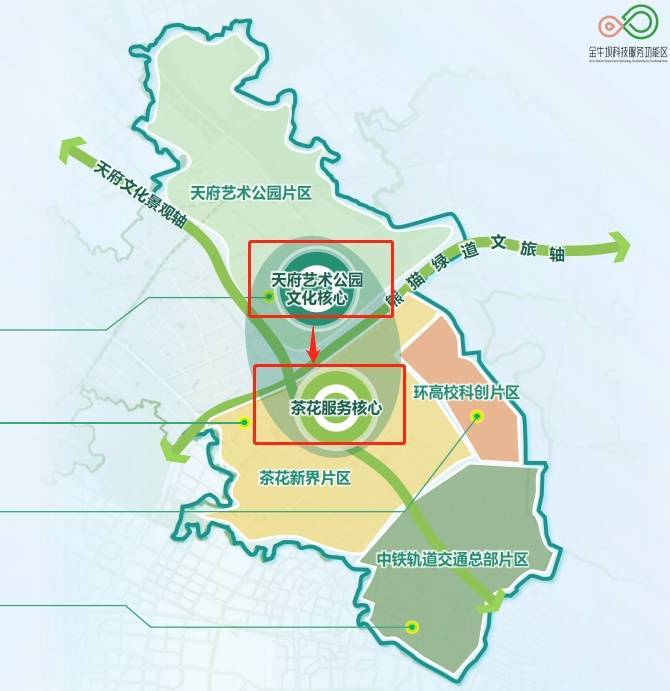 天府艺术公园片区:打造代表四川开放新高度的“一带一路”对外交往中心,规划面积12.6k㎡,以金牛国宾馆和天府艺术公园为核心建设扬天府神韵、放金牛异彩的”蜀都之窗“。