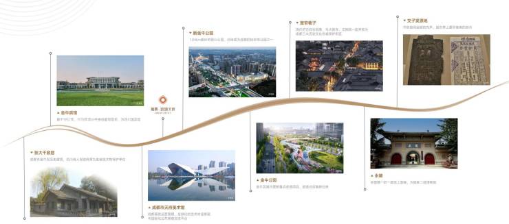 一轴:天府文化景观轴,全长5.8公里,串联了成都最具代表性的文脉资源,历史与现代在此相会,古风蜀韵与公园城市在此交融,成为主城及老城西价值回归的不二门面,轴线串联了永陵博物馆、宽窄巷子、金牛宾馆、天府艺术公园、新金牛公园等城市地标,同时因为金牛宾馆的坐镇,轴线也成为了成都头号礼宾轴线,是成都迎接世界的形象面。雍景致臻天府正位于轴线核芯位置,拥有主城厚重历史文化积淀与城市全新界面。