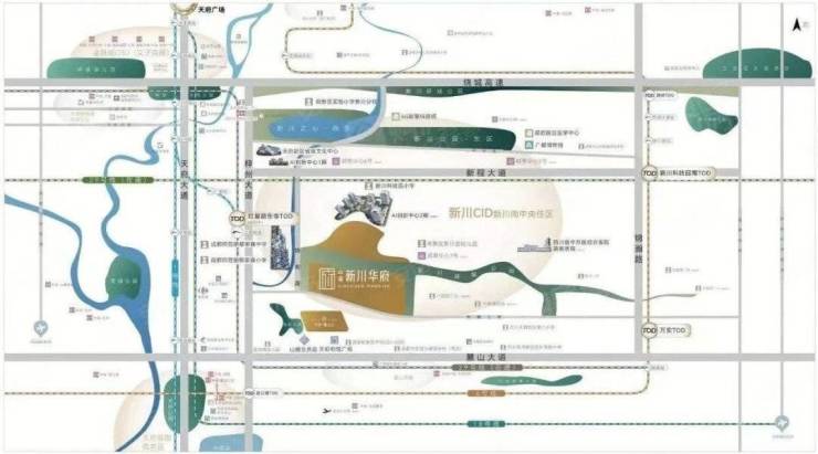 轨道交通:地铁1号线/6号线,北接金融城CBD,南连天府总部商务区,3座TOD叠加区(红星路东寺TOD、新川科技园南站TOD、万安TOD)(规划中),交通缝合成都南北双主场,向东成仁快速路通达。