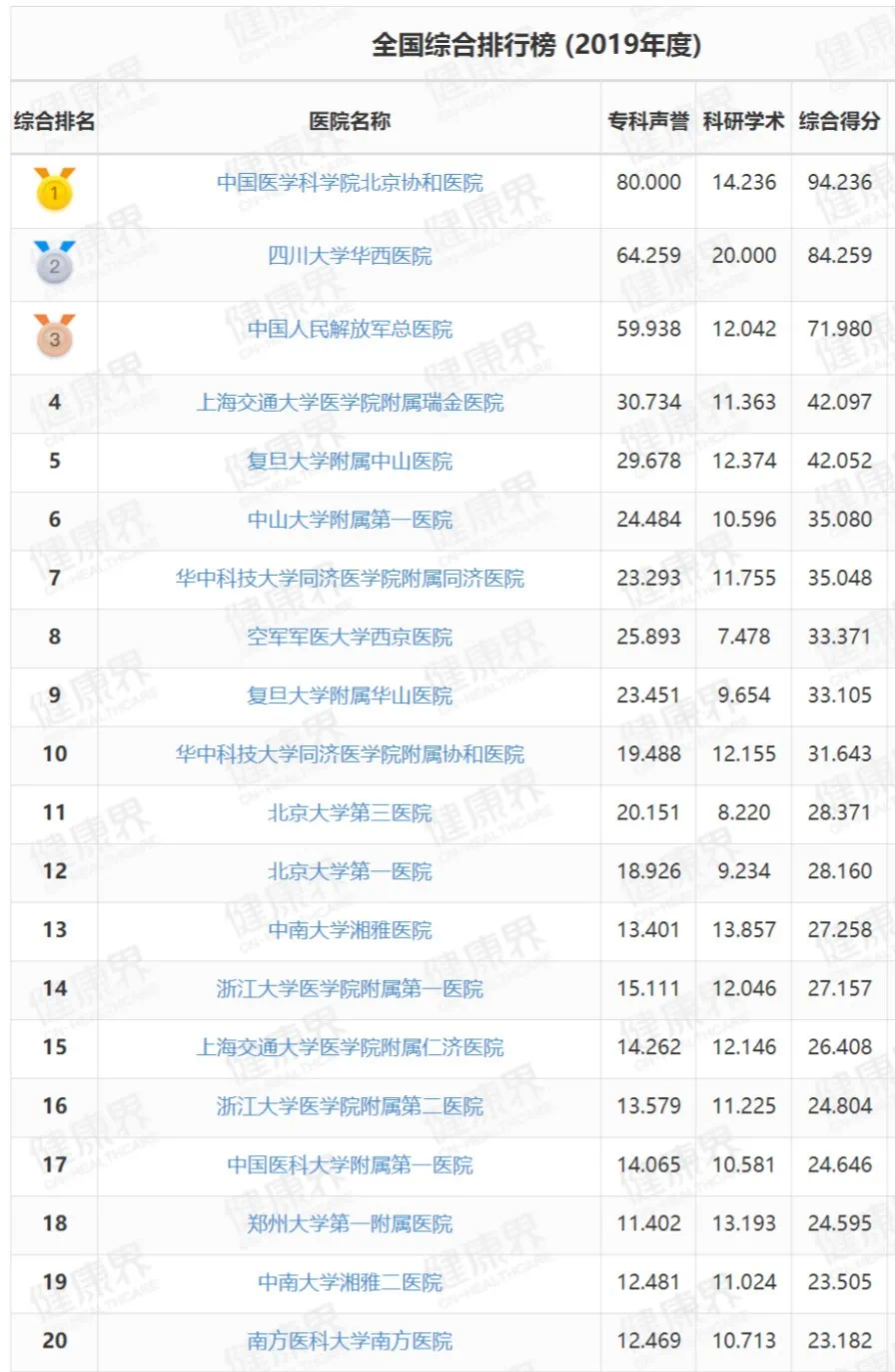 北京协和、四川华西、上海瑞金、广州中山一院、武汉同济医院、西安西京医院等位居前十。