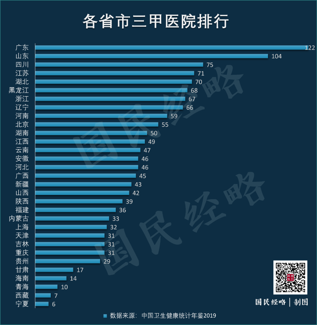 这些省份要么地处偏远,要么缺乏一流医科高校支撑。事实上,这些省份三甲医院数量也处于尾部。