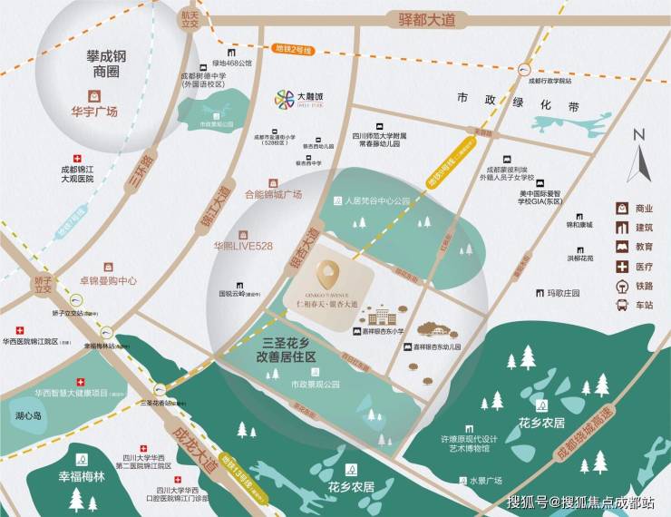 坐拥成都东南黄金区位:横向贯通金融城与行政学院;纵向依托驿都大道,串联攀成钢-东大路商圈,衔接绿地468与行政学院TOD,形成多维交通网络。