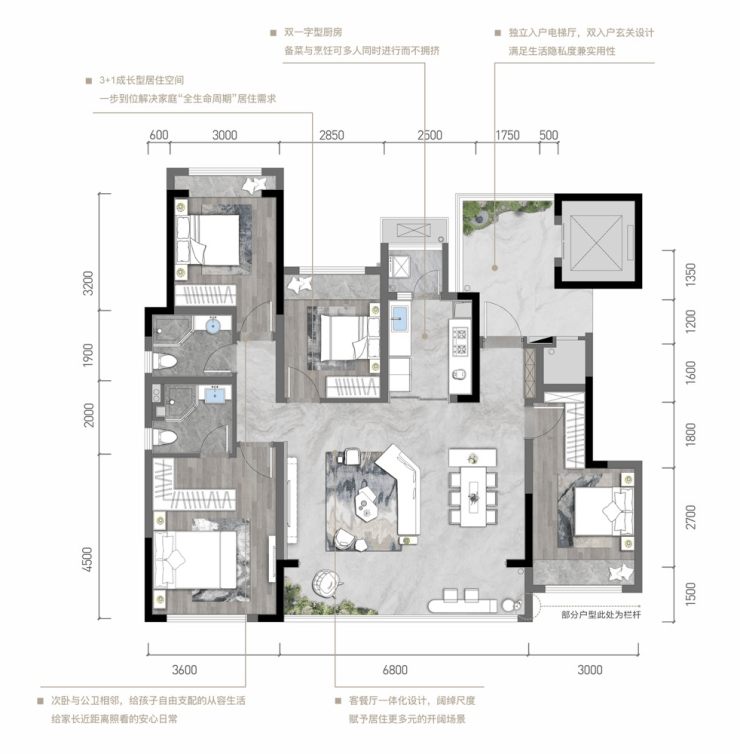 ■ 143㎡四居:17层纯板式设计,两梯两户私密入户;约16米南向面宽,搭配9.25米景观阳台