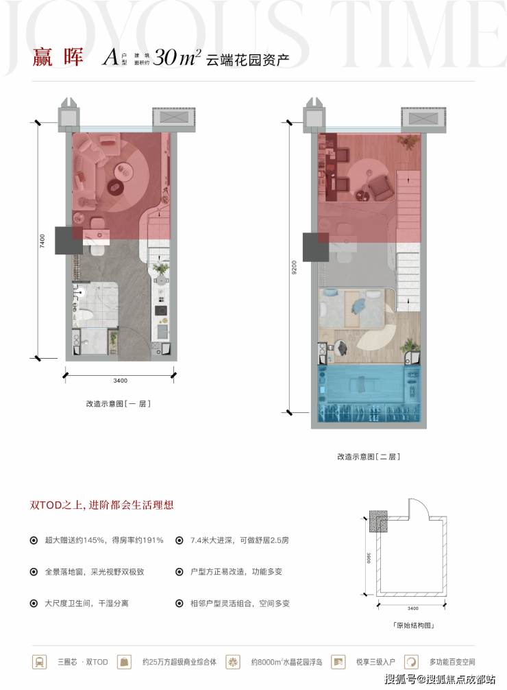 产品优势:户型建面最大得房率高达约336%,实得单价低,30㎡可做舒居2.5房,空间利用率高。