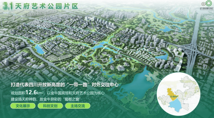 天府艺术公园片区:打造代表四川开放新高度的“一带一路”对外交往中心,规划面积12.6k㎡,以金牛国宾馆和天府艺术公园为核心建设扬天府神韵、放金牛异彩的”蜀都之窗“。