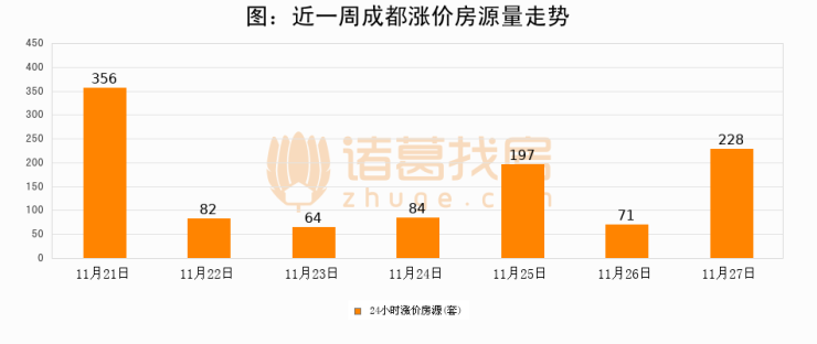 根据诸葛找房数据显示,成都24小时涨价房源量为228套,较11月26日增加157套,环比上涨221.1%。与此同时,涨价房源占比小幅扩大,业主信心有所提升。