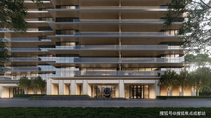 采用玻璃、铝板与石材、陶板的全幕墙体系,结合视觉黄金比例设计,以极简的线条和优雅的配色营造城市公共艺术感,打造出高端公建化的立面效果,与周边489米超塔地标及天府公园形成视觉呼应。