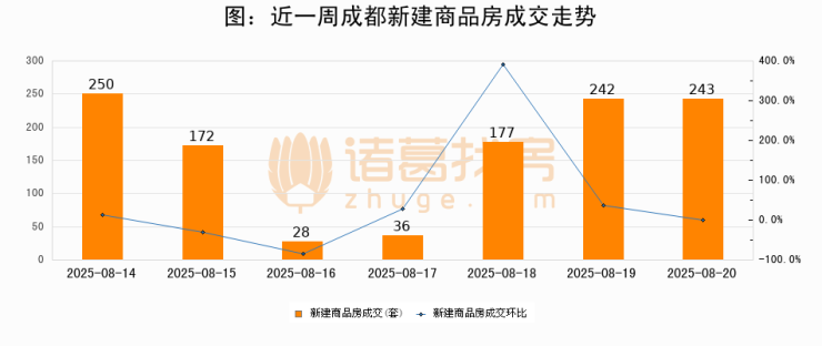 根据成都市住房和城乡建设局数据显示,2025年08月20日成都新建商品房成交243套,较昨日增加1套,环比上涨0.4%