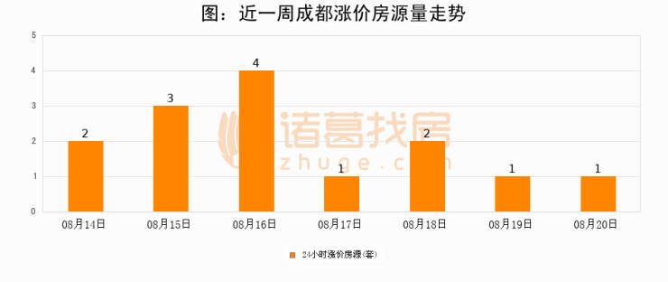根据诸葛找房数据显示,成都24小时涨价房源量为1套,较08月19日持平。