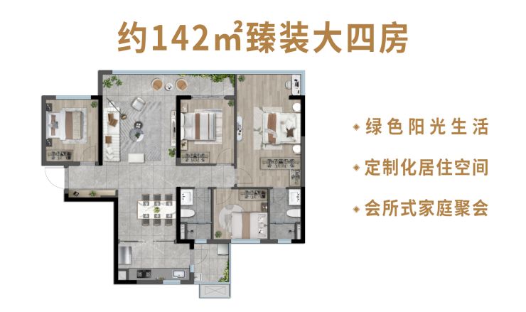 面积:128㎡ 三室2厅2卫 ;142㎡四室2厅2卫