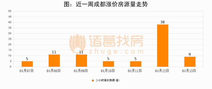 根据诸葛找房数据显示,成都24小时涨价房源量为9套,较04月12日减少29套,环比下降76.3%。与此同时,涨价房源占比小幅回落,对于购房者来说是一个入市窗口期,购房者可抓住时机入市。