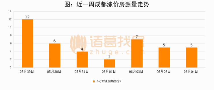根据诸葛找房数据显示,成都24小时涨价房源量为5套,较06月03日持平。