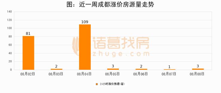根据诸葛找房数据显示,成都24小时涨价房源量为3套,较08月07日增加2套,环比上涨200%。与此同时,涨价房源占比小幅扩大,业主信心有所提升。