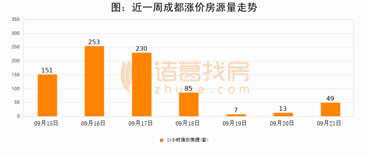 根据诸葛找房数据显示,成都24小时涨价房源量为49套,较09月20日增加36套,环比上涨276.9%。与此同时,涨价房源占比小幅扩大,业主信心有所提升。
