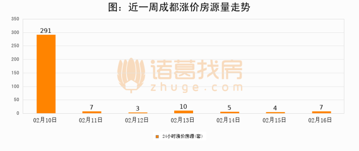 根据诸葛找房数据显示,成都24小时涨价房源量为7套,较02月15日增加3套,环比上涨75%。与此同时,涨价房源占比小幅扩大,业主信心有所提升。