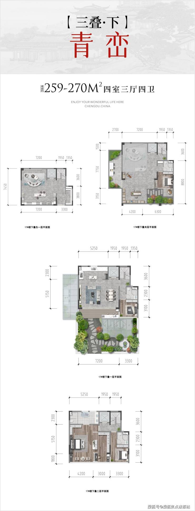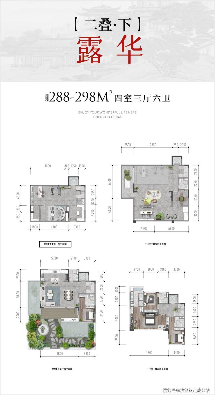 【三叠】上叠:四室两厅三卫 | 约226 - 242㎡ 【三叠】中叠:四室两厅三卫 | 约207 - 215㎡ 【三叠】下叠:四室三厅四卫 | 约259 - 270㎡ 【两叠】上叠:四室三厅五卫 | 约249 - 265㎡ 【两叠】下叠:四室三厅六卫 | 约288 - 298㎡ 【区位价值】