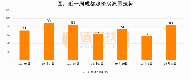 根据诸葛找房数据显示,成都24小时涨价房源量为83套,较03月11日增加26套,环比上涨45.6%。与此同时,涨价房源占比小幅扩大,业主信心有所提升。