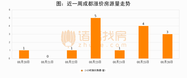 根据诸葛找房数据显示,成都24小时涨价房源量为3套,较08月25日减少1套,环比下降25%。与此同时,涨价房源占比小幅回落,对于购房者来说是一个入市窗口期,购房者可抓住时机入市。