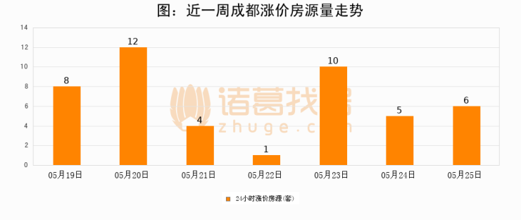 根据诸葛找房数据显示,成都24小时涨价房源量为6套,较05月24日增加1套,环比上涨20%。与此同时,涨价房源占比小幅扩大,业主信心有所提升。