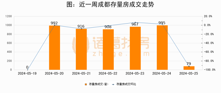 从存量房来看,2024年05月25日成都存量房单日成交79套,比昨日减少916套,环比下降92.1%。从近一周存量房成交来看,成都存量房日均成交套数为693套,05月25日单日成交79套,低于近一周平均水平88.6%。
